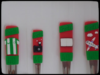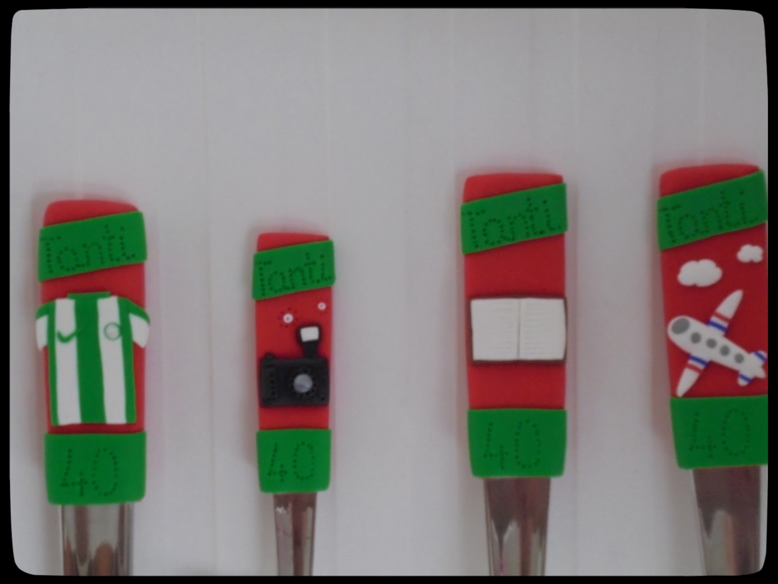 Amikor a nagynéném kerek születésnapja közeledett, a Táblácska mellett (amit anyukáméktól kapott) szerettem volna még valami személyessel megajándékozni őt, így ismét megkerestem Apolkát. A sok rendelés mellett biztosan nem emlékezett rám, de olyan örömmel válaszolt az üzenetemre, mintha minden nap kapcsolatban lennénk egymással. Meghallgatta az összes kívánságomat, ötletemet, és a korábbi alkalomhoz hasonlóan, most is nagyon gyorsan dolgozott. Mivel most egy 4 darabból álló készletet rendeltem, több munkát is láthattam tőle, hiszen mindegyikre más-más mintát kértem. T.-nek több hobbija is van, próbáltam ezek közül kiválasztani azokat, amik a legjellemzőbbek rá. Így a Fradi szeretete, a fotózás, az olvasás és az utazás négyese tűnt a legjobb választásnak. Apolka rávarázsolta a kanalakra, késre és villára a kívánt képeket, a legaranyosabb és legapróbb részletekkel. Imádtam őket egymás mellett látni.