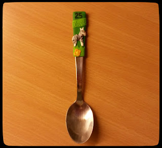 Mivel D. éppen a 25-öt töltötte, ezért evidens volt, hogy ez a szám szerepeljen azon a kanálon, ami fagyizáshoz éppen kiváló lesz (mert nála nyáron a fagyi a nap fénypontja). Szereti a zöld színt, többek között azért, mert fradista, és szereti a zebrákat is. Úgy, mint a Juventust, és úgy is, mint magát az állatot. Amikor az állatkertben jártunk, rengeteget álltunk a zebráknál, D. mindegyiket megsimogatta vagy ötvenszer, és szerencsére az állatok is nagyon kedvelték őt. Mindig visszalépkedtek hozzá, egészen közel dugták az orrukat a kerítéshez, így könnyű volt babusgatni a kis bűzgolyókat. (D. nem is volt rest) Gondoltam, hogy ha egy zebra is rajta van a kanálon, az nem lehet rossz választás. Így történt, hogy felvettem Apolkával a kapcsolatot, aki több email-ben egyeztetve nagyjából elmondta, hogy hogyan lehet megvalósítani az elképzeléseimet. A végeredményben nem csalódtam, nagyon szuper lett a fagyiskanál. Mosható mosogatógépben is, nem csak kézzel, nagyon strapabíró, és nagyon mutatós. Apolka pedig precízen, pontosan dolgozott, hamar elkészült az ajándékkal, és igazán kedvesen válaszolt az összes primitív kérdésemre.